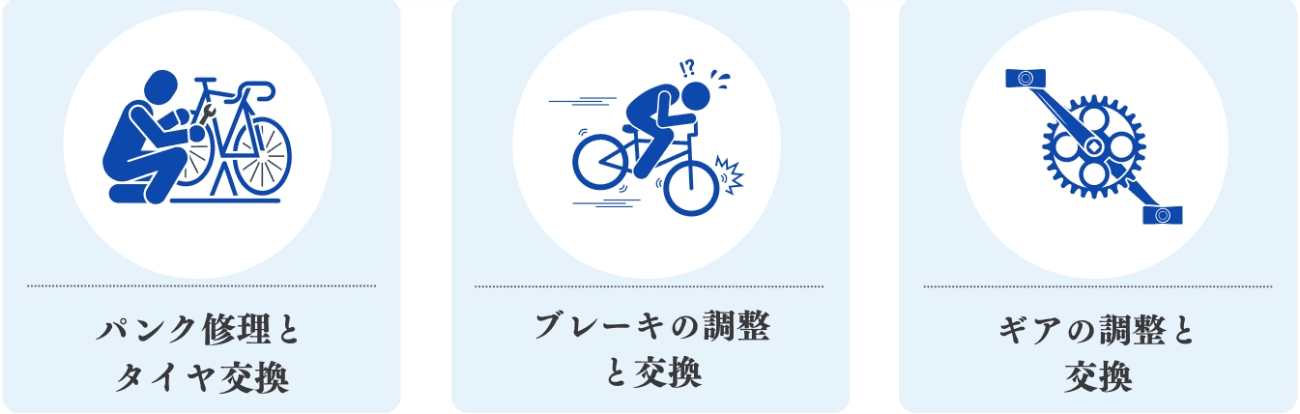 パンク修理、ブレーキ調整、ギア交換などさまざまな修理に対応し安全性と品質にこだわります。