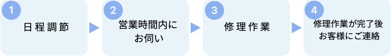お客様のご都合に合わせて、最適な日時を調整いたします。対応時間については、営業時間内にお伺いし、修理作業を行います。修理作業が完了次第、お客様にご連絡いたします。