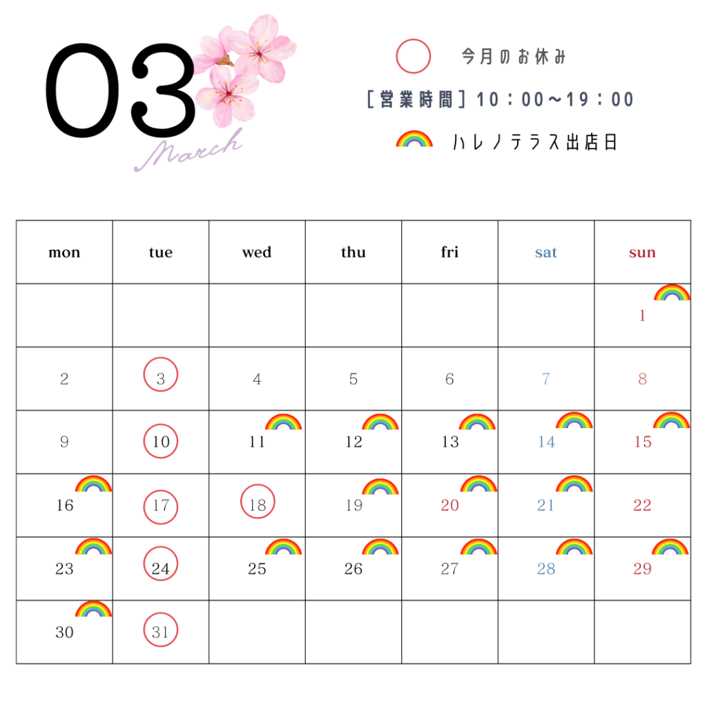3月の定休日につきまして、以下の通り変更させていただくこととなりました。
